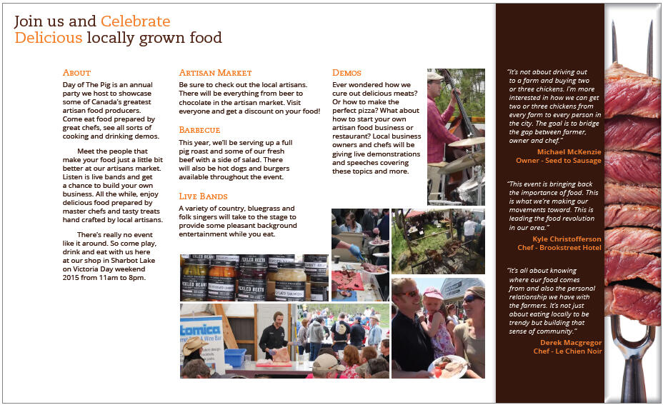 The Seed to Sausage store, itself, is a great place to start. Some inspirational locations would be natural woodland areas and open fields around the Sharbot Lake area. Several farms in and around Sharbot Lake are directly related to Seed to Sausage as they provide the locally grown meats used in their foods. The designated festival location is a great place to check out; the marketing material should be designed with it in mind. There are also other places where community events take place, like the Sharbot Lake park and beach area.