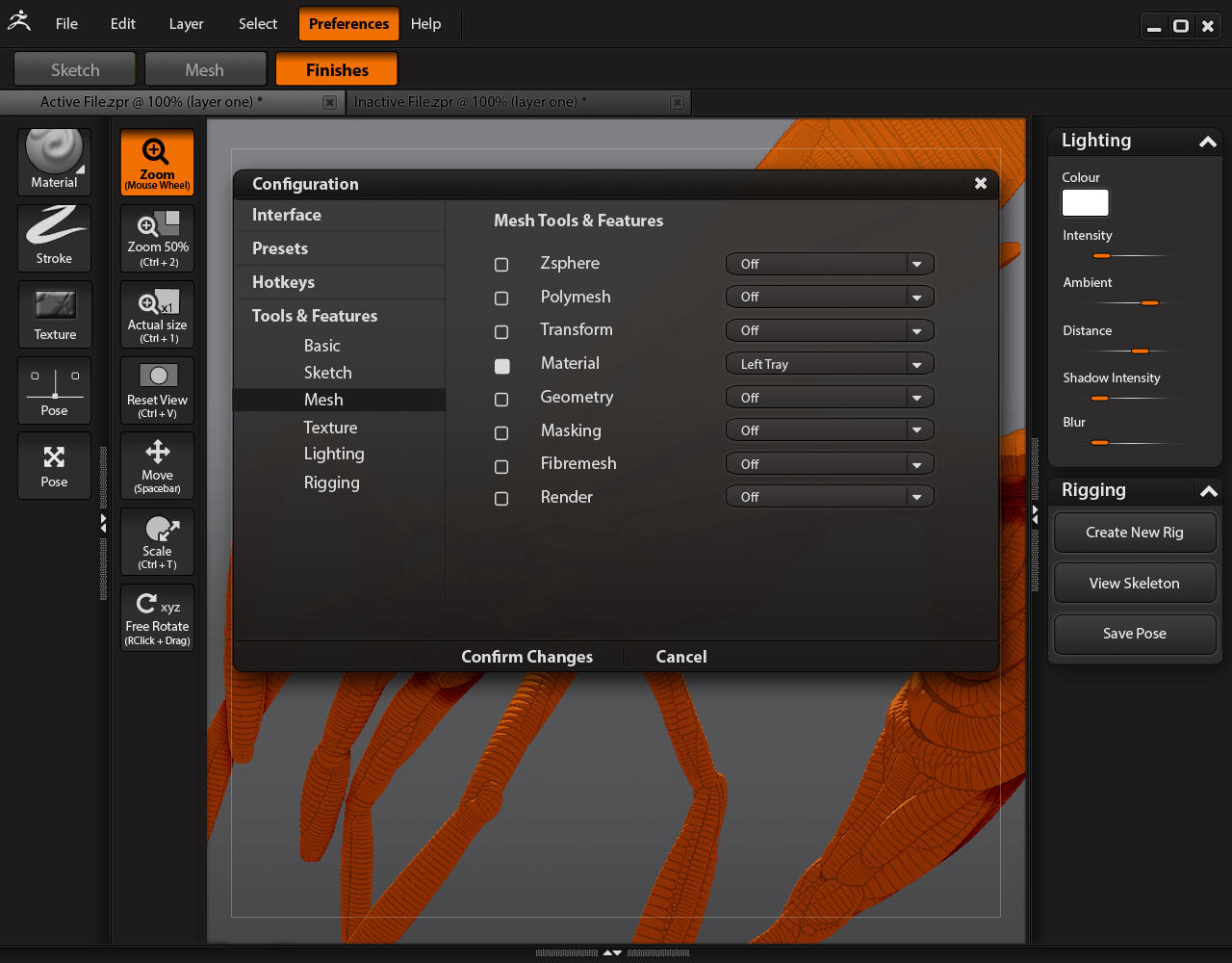After initially organizing the workspace into five sections, it was further simplified into 3. The Texture, Pose, and Lighting modes were condensed into a single “Finishes” mode so that users could add final touches to a project without having to switch between the last three modes. Mode buttons were also treated differently depending the stage of a user’s workflow. Since it is impossible to move backwards through modes, (ex: sketching over meshes or remodeling a mesh after applying some textures) each previous mode was changed to appear “greyed out” whenever a user progressed to the next mode. This gives users a visual indication that they can no longer edit in the previous mode.