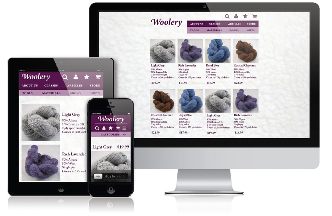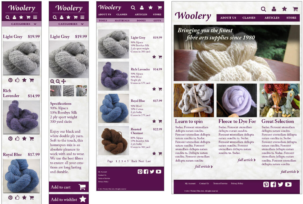 The original green of the current website was changed to a more feminine purple to appeal to the target audience, and to add a luxury feel to the products. The background was also given a subtle wool texture to tie into the subject matter. Navigation items were simplified into symbols at smaller breakpoints, while full labels were used at larger breakpoints to create a sense of balance.
