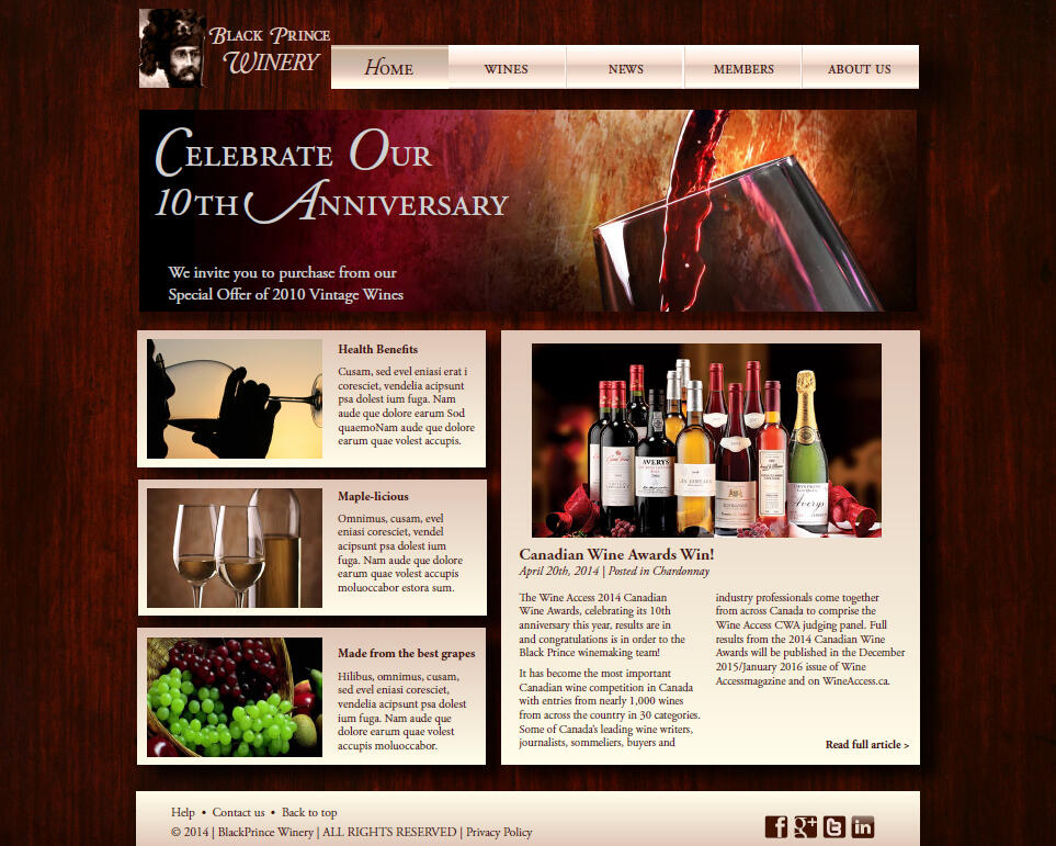 The biggest challenge with reworking this website was the amount of content organization that needed to be done. The most important information is currently very hard to find since everything seems to be shuffled together. The organization of content makes no sense and the content itself is too long and often irrelevant. Unnecessary content was removed and the rest was reorganized using simple, understandable headings in the navigation bar.The old left navigation bar was replaced with a more functional global navigation with relevant headings. Fewer main headings now keep things simple and easy to find. The wine store section includes a new search feature and a side bar to browse through wine quickly. The global navigation remains constant throughout the entire website, unlike in the original design.The entire colour scheme of grey and brown was changed to a luxurious burgundy and ivory pallet, to catch the eyes of viewers, and create clear contrast between elements. The hierarchy of text was fixed, not only with the size and font of type, but with the imagery and feature boxes as well. The current images used for this website lack transparent backgrounds and often have a large white square around them. They are seen randomly placed in between text and don’t relate to the content. These images were replaced with high quality feature images that accurately reflect the content.